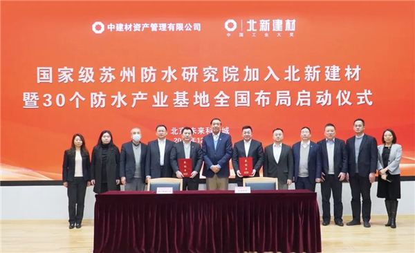 ? ? 2020年12月30日,防水行業(yè)唯一國家級研究院——中國建筑材料科學研究總院蘇州防水研究院(以下簡稱“蘇州院”)加入北新集團建材股份有限公司(以下簡稱“北新建材”)簽約儀式在北京未來科學城北新中心舉行。北新建材黨委書記、董事長王兵和中建材資產管理公司黨委書記、執(zhí)行董事、總經理高則懷分別代表雙方簽署戰(zhàn)略合作協(xié)議,中國防水協(xié)會秘書長朱冬青代表行業(yè)見證簽約,簽約儀式由北新建材副總經理管理主持。中建材資產管理公司副總經理劉志平、財務部總經理商慶國,蘇州院院長巢文革、副院長瞿建民、總工程師楊勝,以及北新防水集團在京干部員工見證簽約。